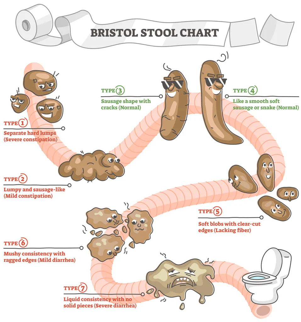 Behold the ‘Bristol Stool Chart’, it’s like the Rosetta Stone for your gut, categorising your output into 7 distinct types to determine what’s normal and what’s not. Knowing where your daily deposit lands on this chart is the first step to understanding your digestive health. I promise this royal flush of knowledge will be worth the cringiness.